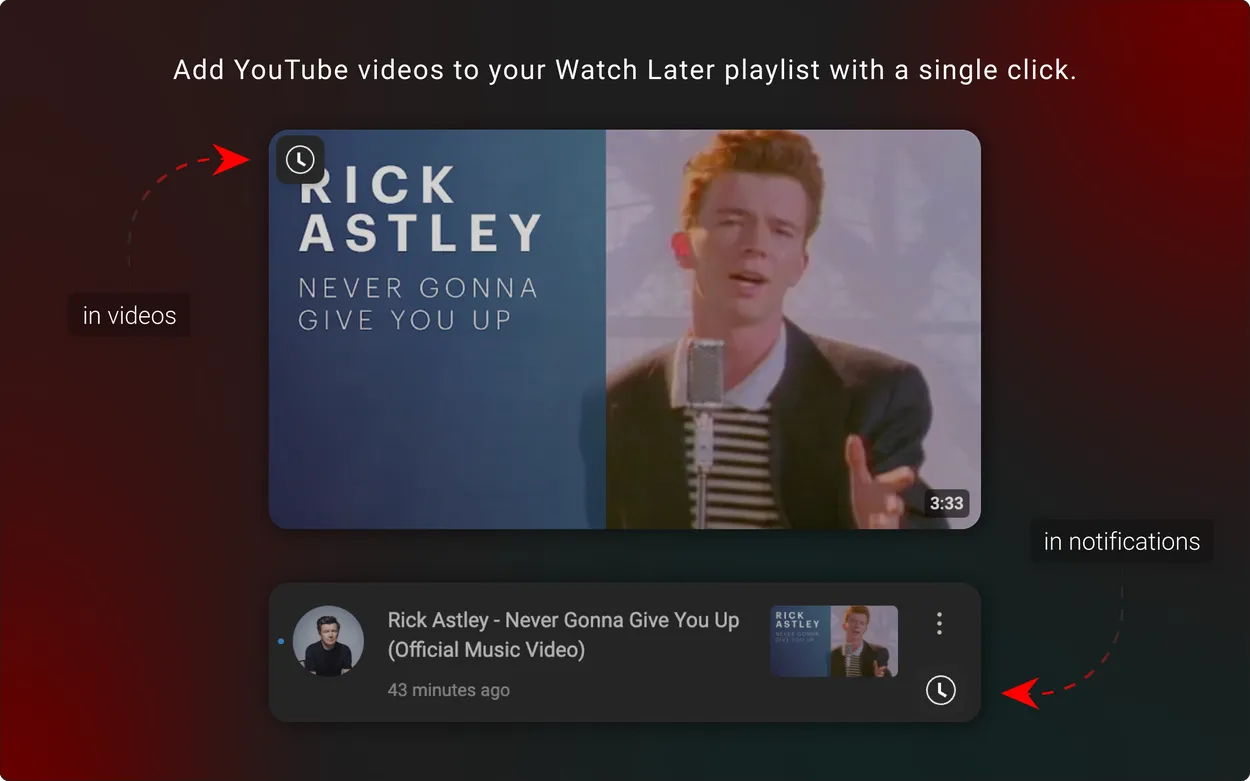 A browser extension that allows you to add YouTube videos to your Watch Later playlist with a single click.